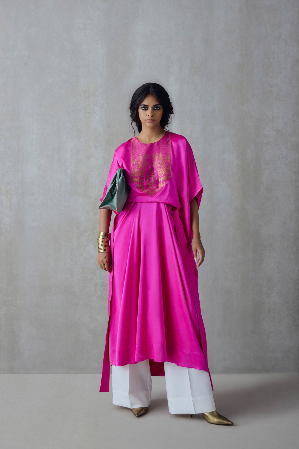 Crafted from lightweight silk, this belted dress features a draped detail at the waist, lending it a subtle shape. Its one-size fit flatters varied body types and is finished with an engineered brocade yoke.