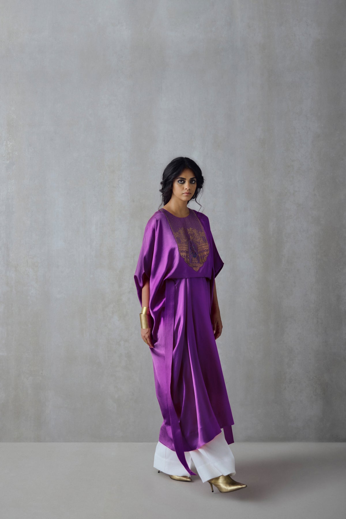 Crafted from lightweight silk, this belted dress features a draped detail at the waist, lending it a subtle shape. Its one-size fit flatters varied body types and is finished with an engineered brocade yoke.