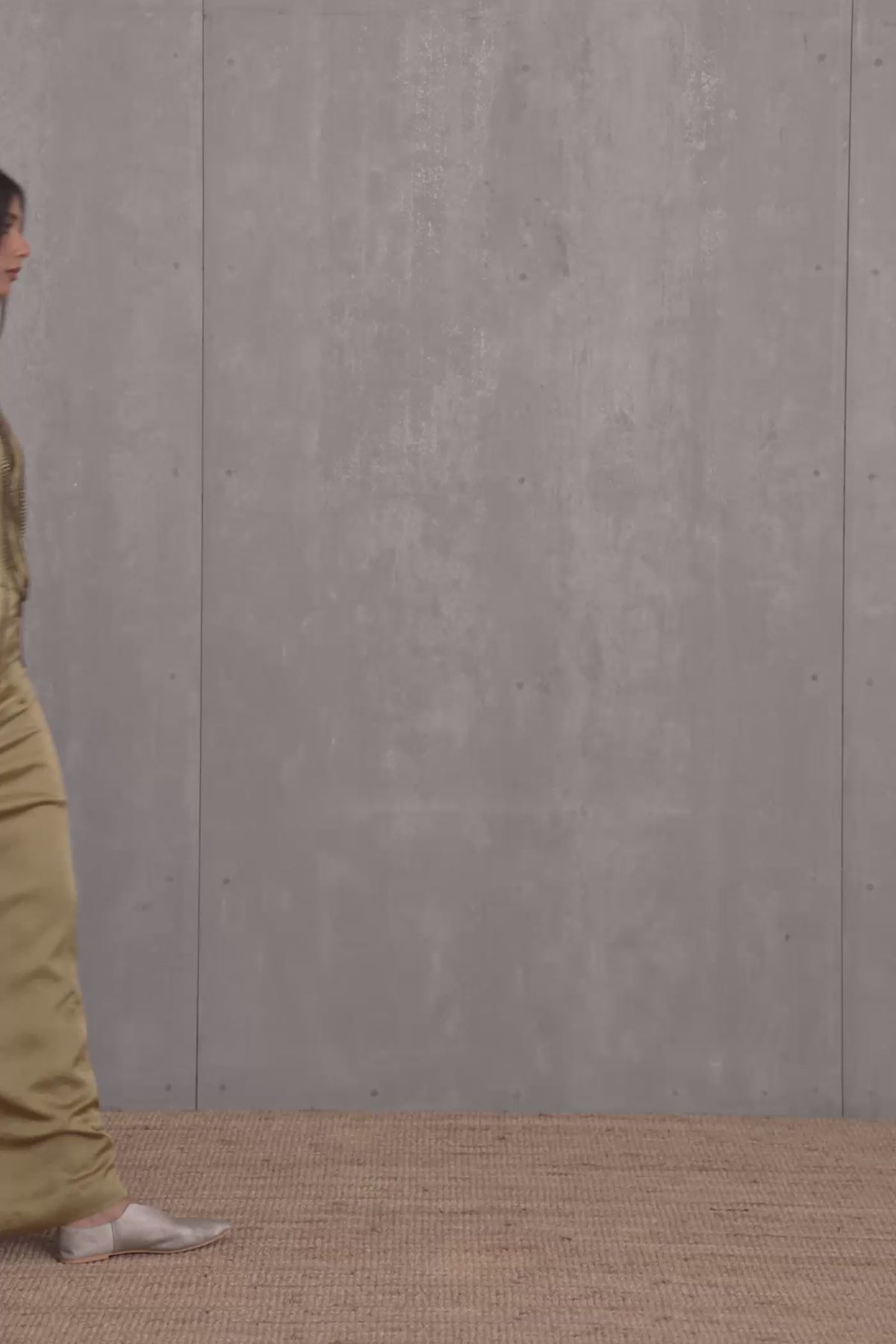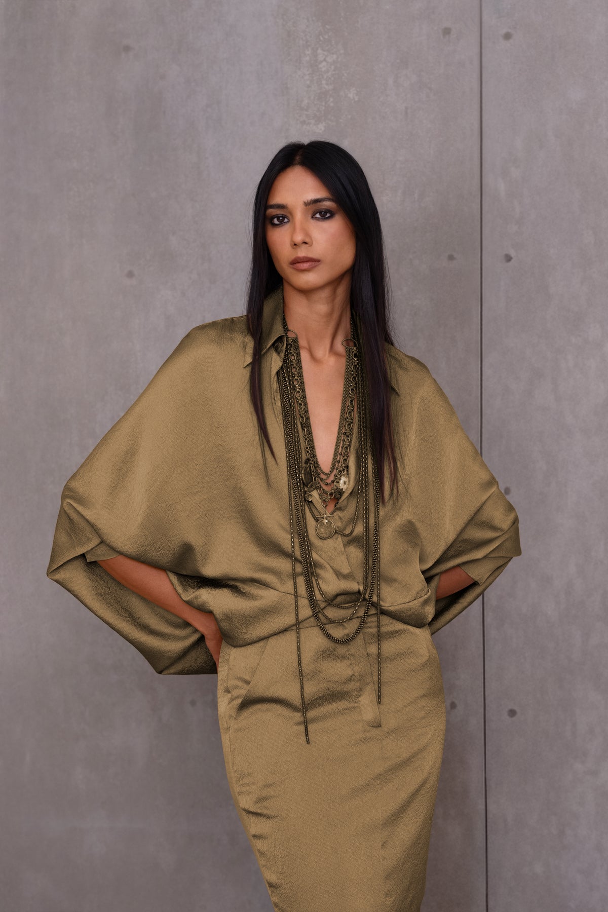 Designed with a zero-waste approach, this dress combines two square pieces of fabric, folded like origami to create a sculptural silhouette that mimics the form of a shirt and skirt. Its considered construction lends both shape and ease of movement, and it is finished with a centre-back slit, functional pockets and a concealed buttoned placket.