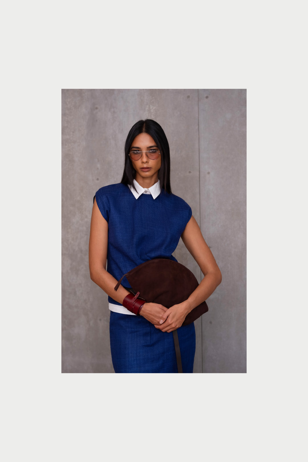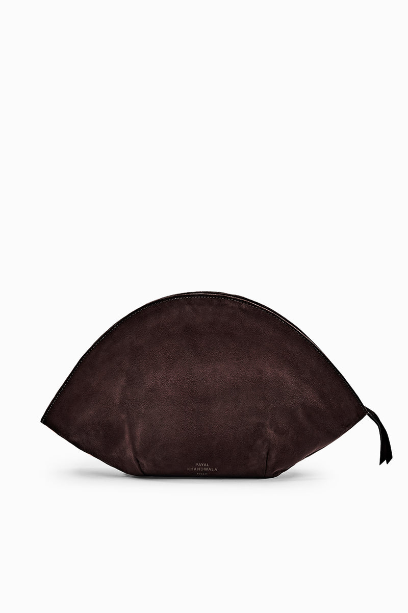 Our halo clutch bag is defined by a curved, semi-circle form, lending it a sculptural presence. Crafted in the finest suede, it is lightweight and easy to carry, with a spacious interior organized with an inside pocket. It is finished with a zip closure, contrast lining and a subtle pleated detail at the base that adds depth to the form.