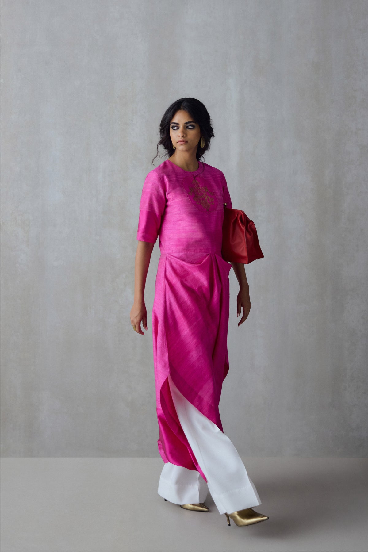 This jumpsuit balances structure with fluidity in a contemporary silhouette. The draped detail enhances ease of movement, while the pockets add comfort. Handwoven to create subtle shifts in texture, it is finished with brocade details at the yoke and a concealed zipper at the back.
