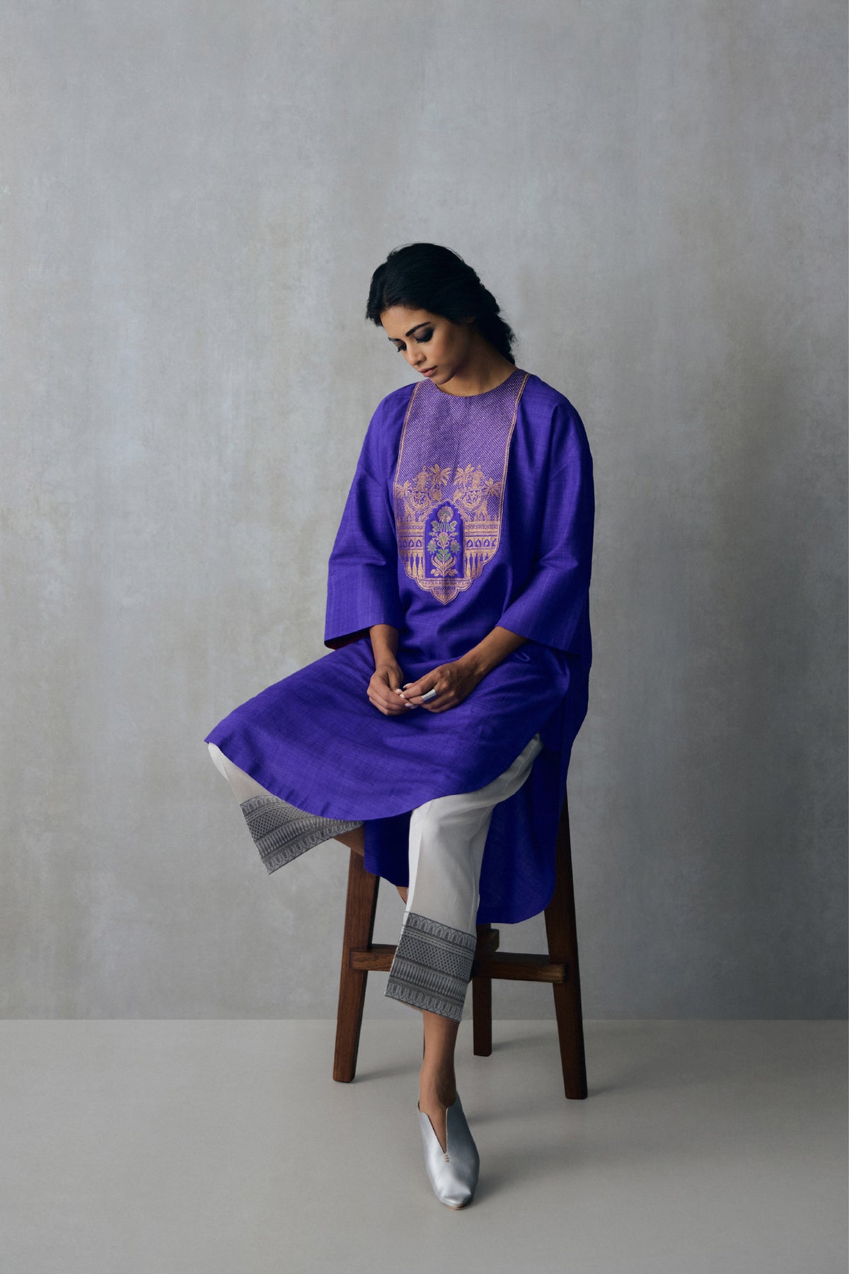 A handwoven silk tunic with an engineered brocade yoke at the front and back. Its high-low hemline lends an effortless twist to this classic silhouette, while the deep pockets offer comfort.