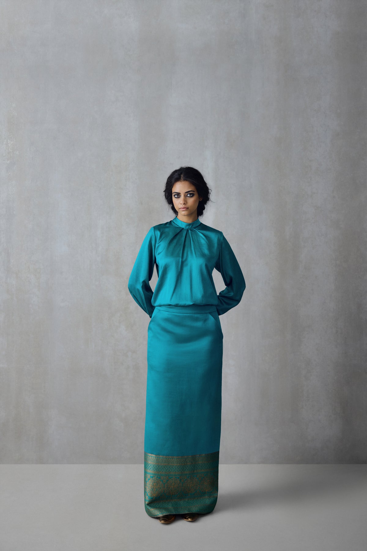 Handwoven in silk satin, this versatile blouse pairs just as well with jeans as with a lehenga, making it a true multi-duty piece. It features a pleated detail at the neckline and cuffs, and a concealed zipper at the back.
