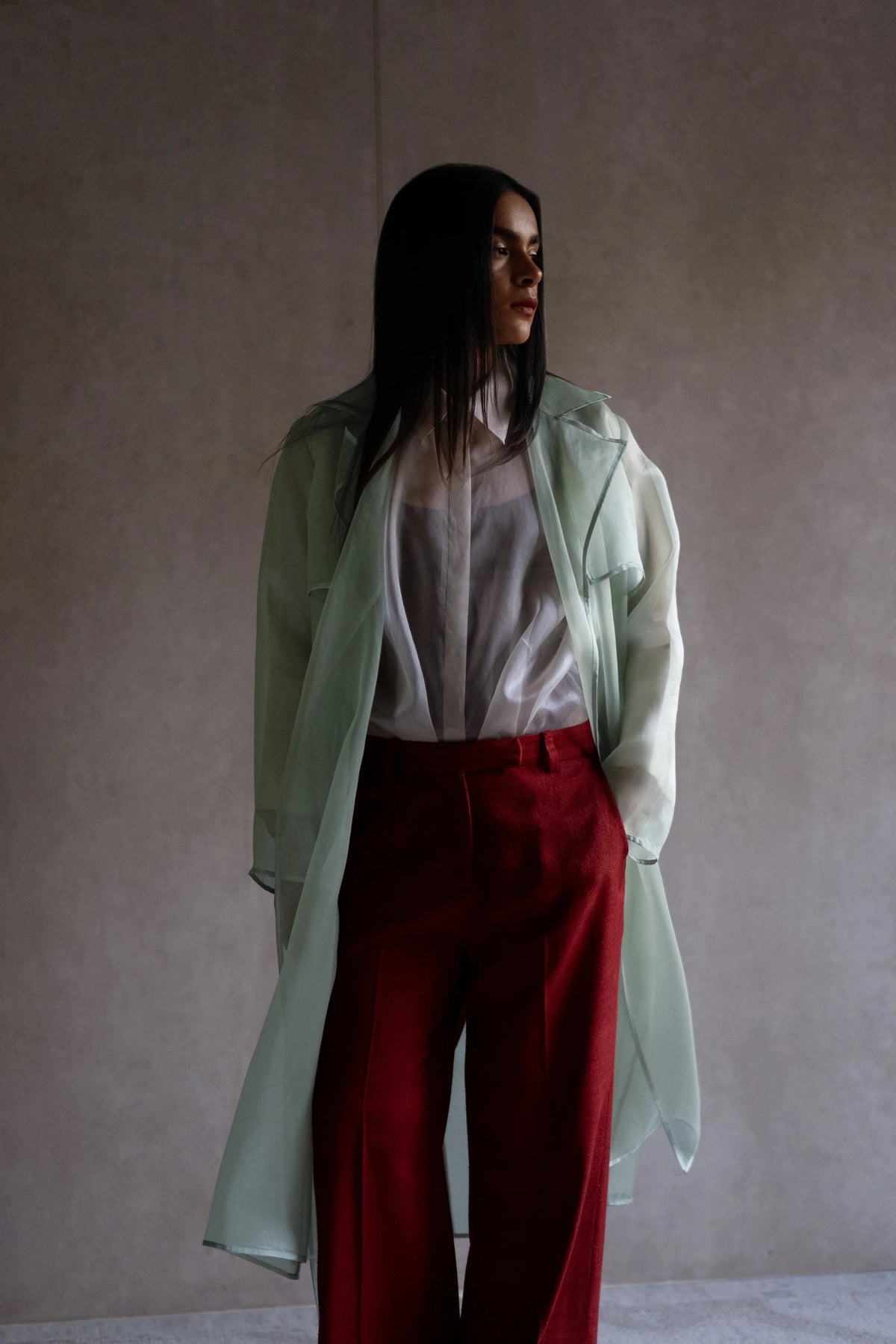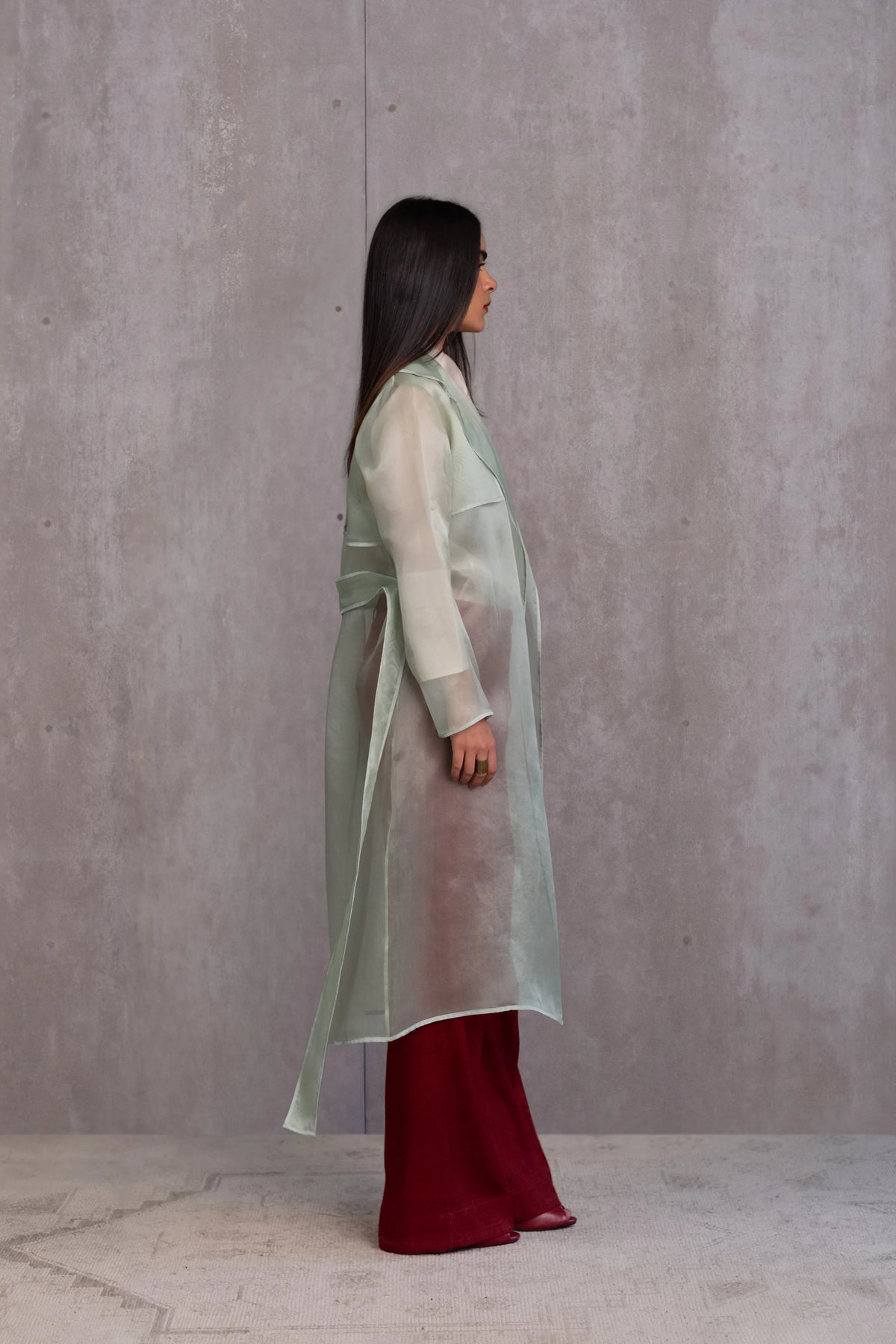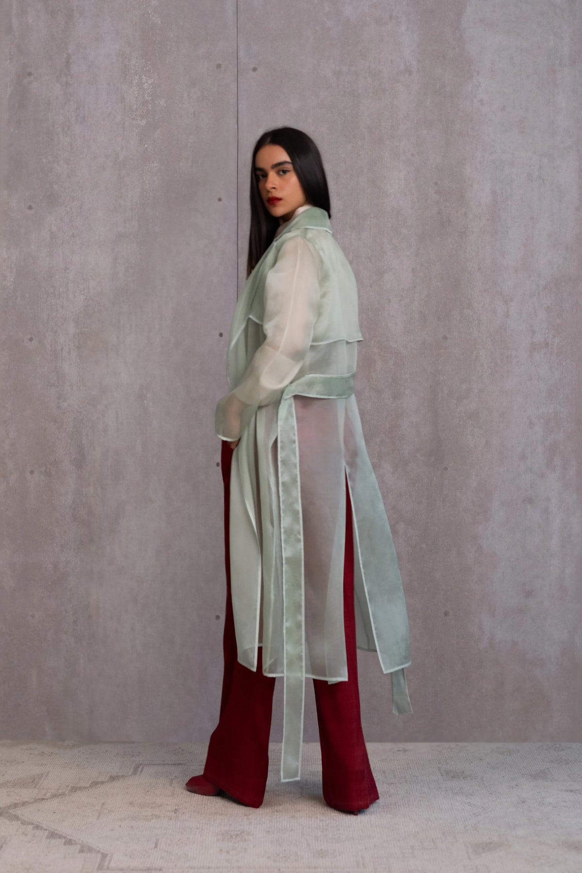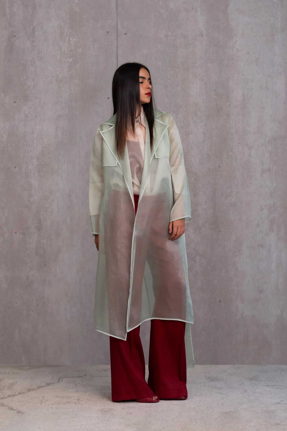 Crafted in silk organza, this diaphanous trench coat is designed to be a versatile layering piece. It features a classic lapel collar and a belt for a structured finish.