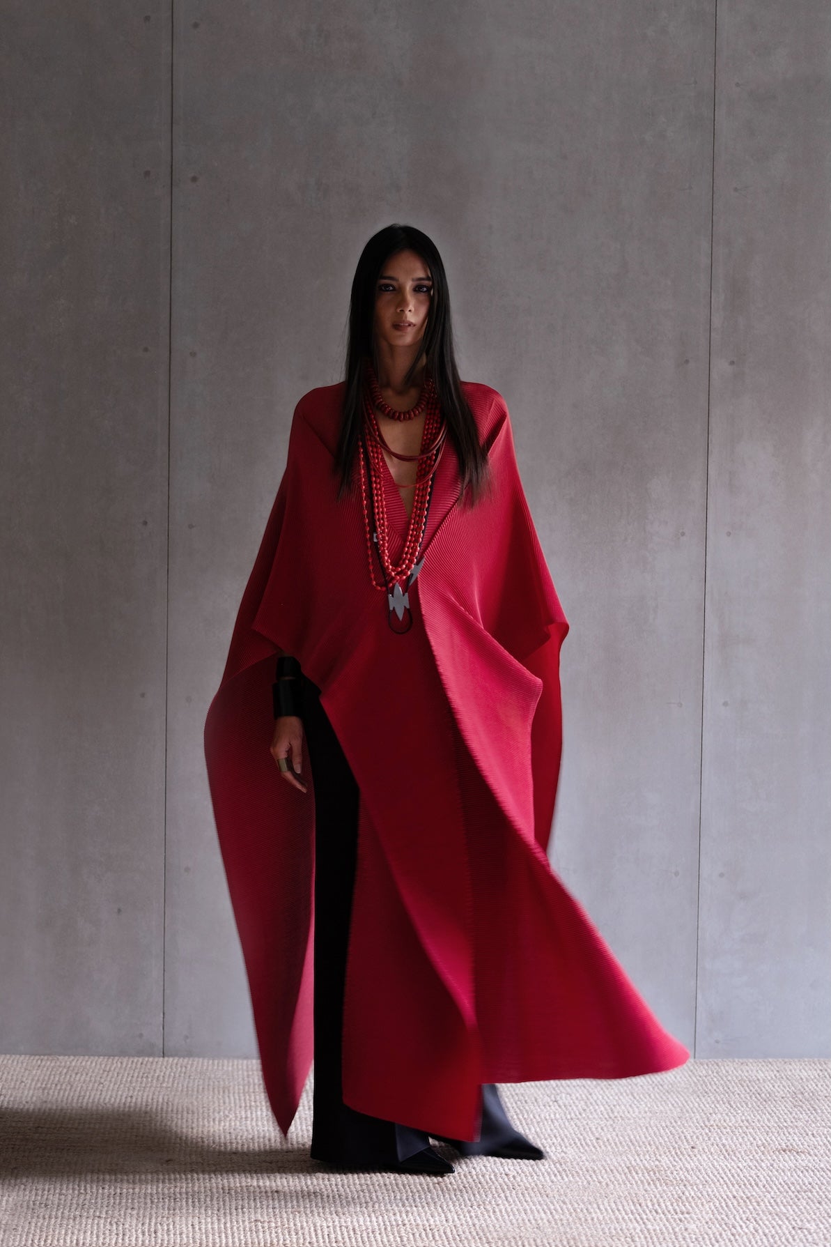 Inspired by the origami drape, our pleated cape adds the right amount of drama with its fluid fit and deep neckline.