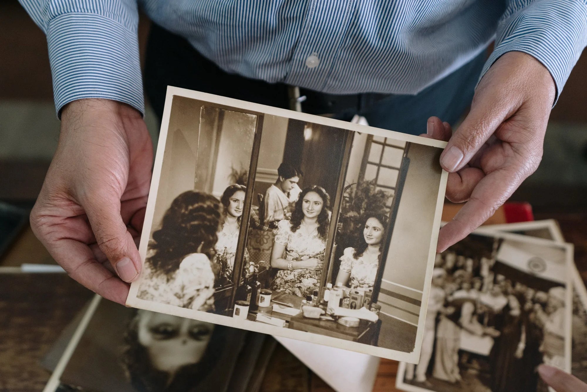 Girls from the Gujarati community would come to Vanguard Studios with flowers in their hair and dangle their feet over a paper moon while sitting on a chair. A photograph in this type of a setting was a must, they had just completed a one-week fast called Mora Kat for their future good luck!