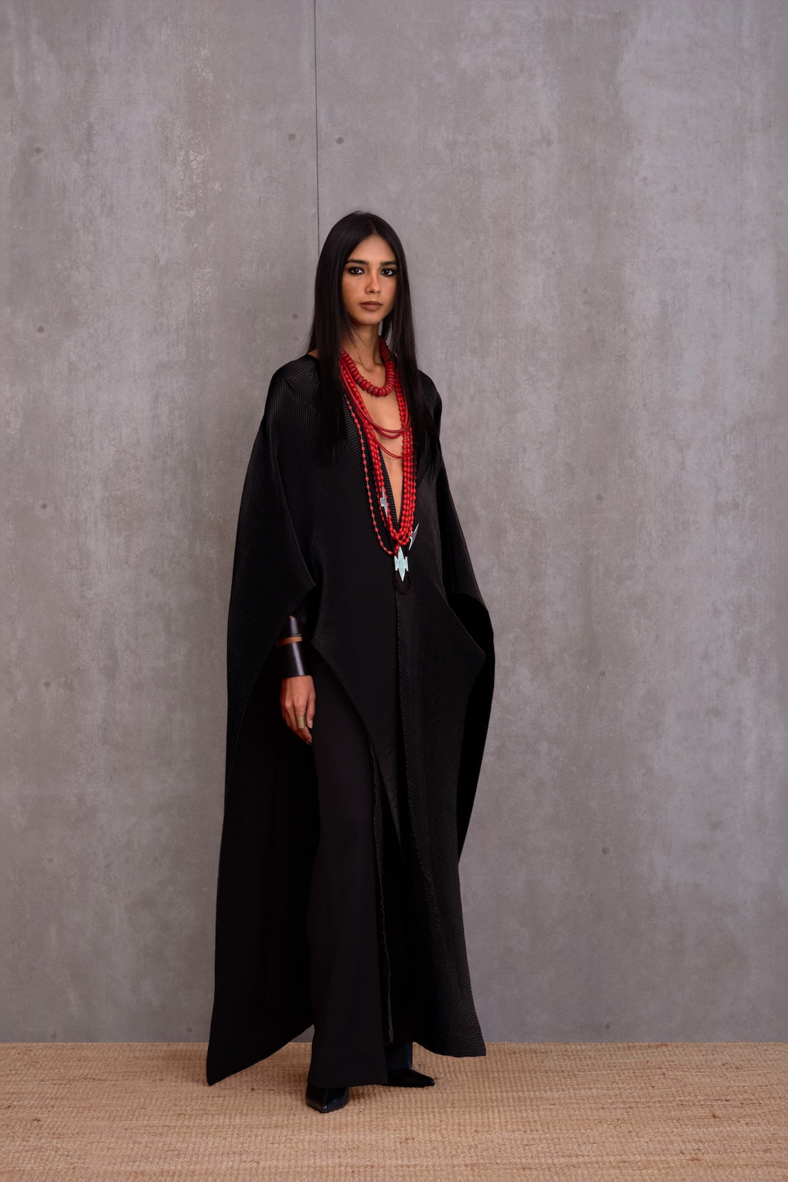 Inspired by the origami drape, our pleated cape adds the right amount of drama with its fluid fit and deep neckline.