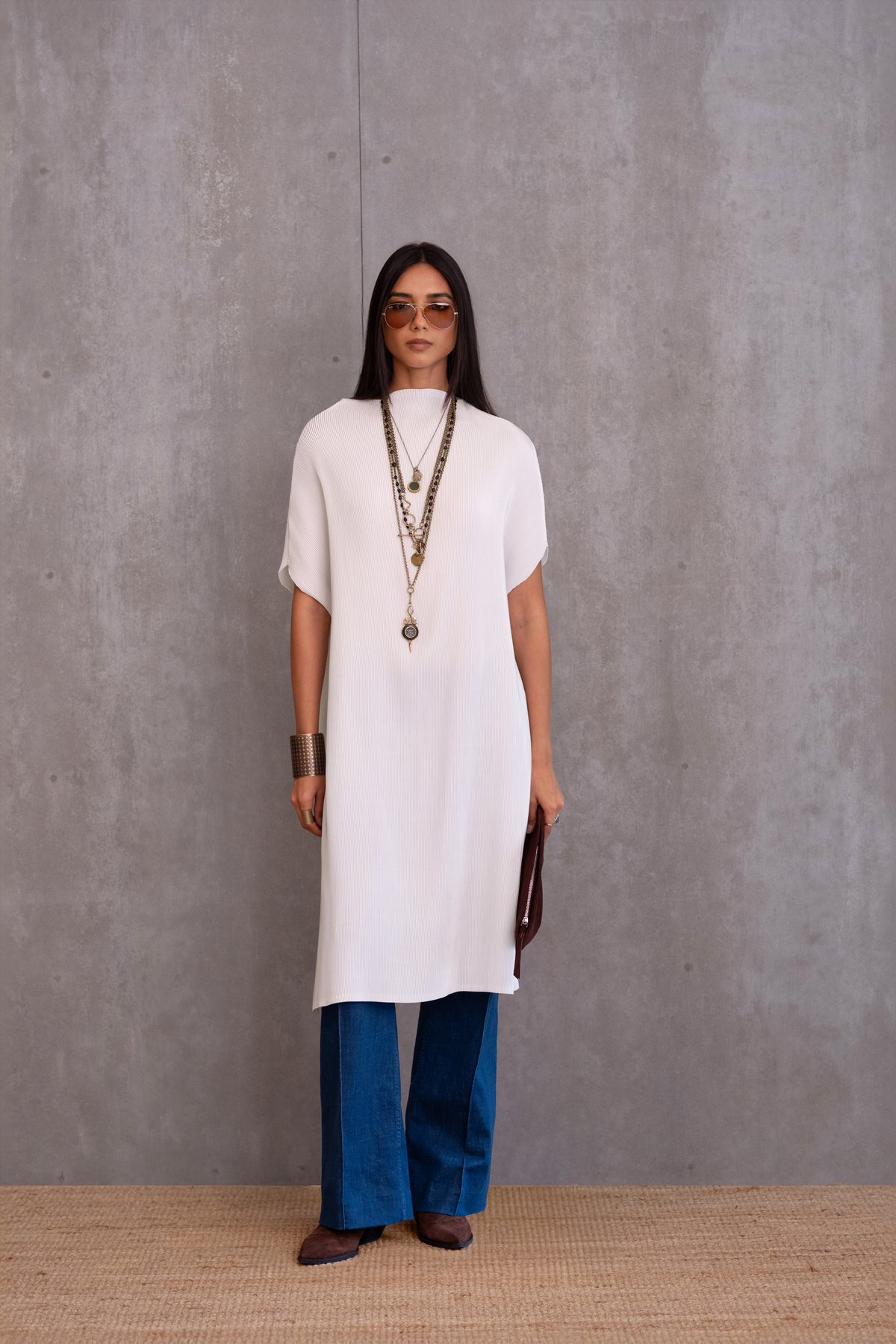 The pleated tunic is a strong option for days when you need to transit from the office to a dinner out.