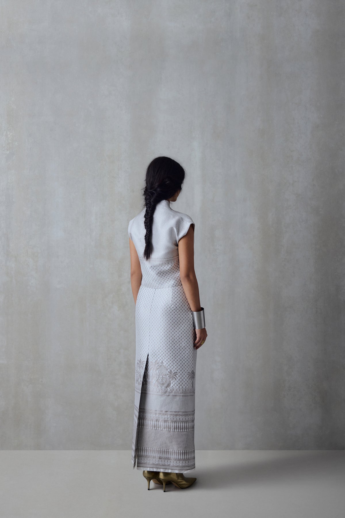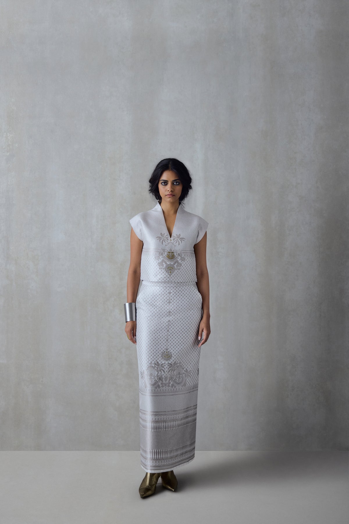 An engineered brocade top featuring our signature motifs. Handwoven in silk, it has a structured silhouette, a collared V-neck and a concealed zipper at the side.