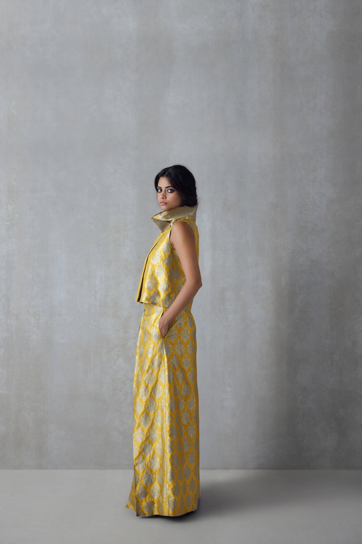 Featuring an architectural collar, this silk brocade waistcoat offers a modern take on a classic silhouette, and is finished with a contrast lining.