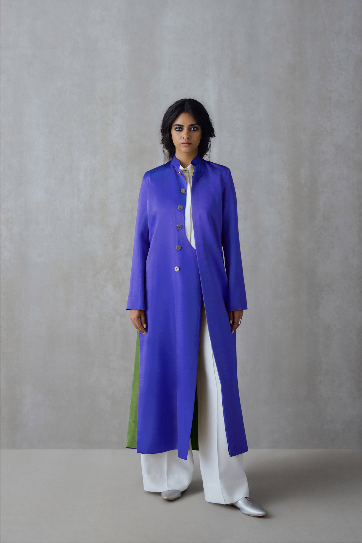 Designed for easy layering, this longline jacket is handwoven in silk, featuring a mandarin collar and deep side slits.