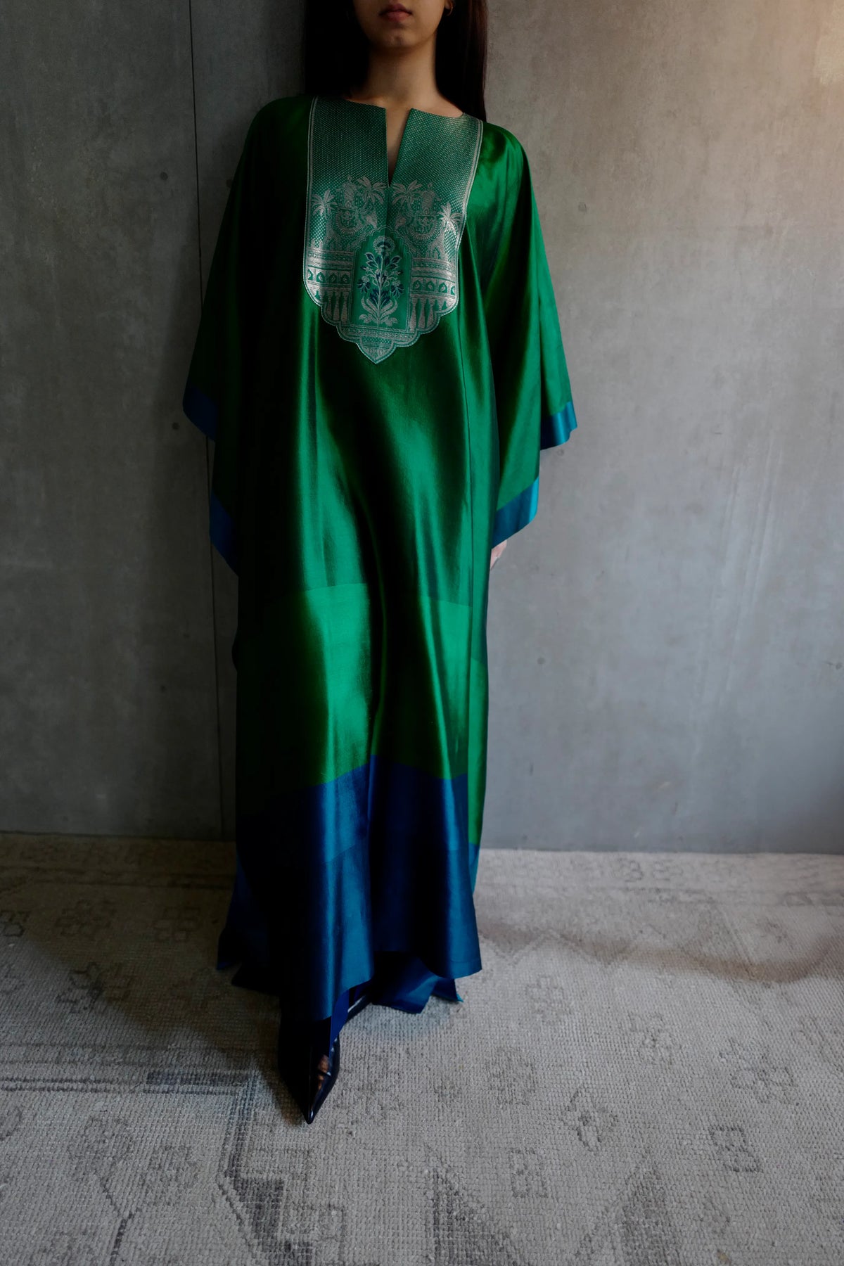 Featuring our signature colour-blocking, this silk kaftan is handwoven to create subtle shifts in sheen and texture. It is finished with an unstructured shoulder, deep side slits and engineered brocade details at the yoke.