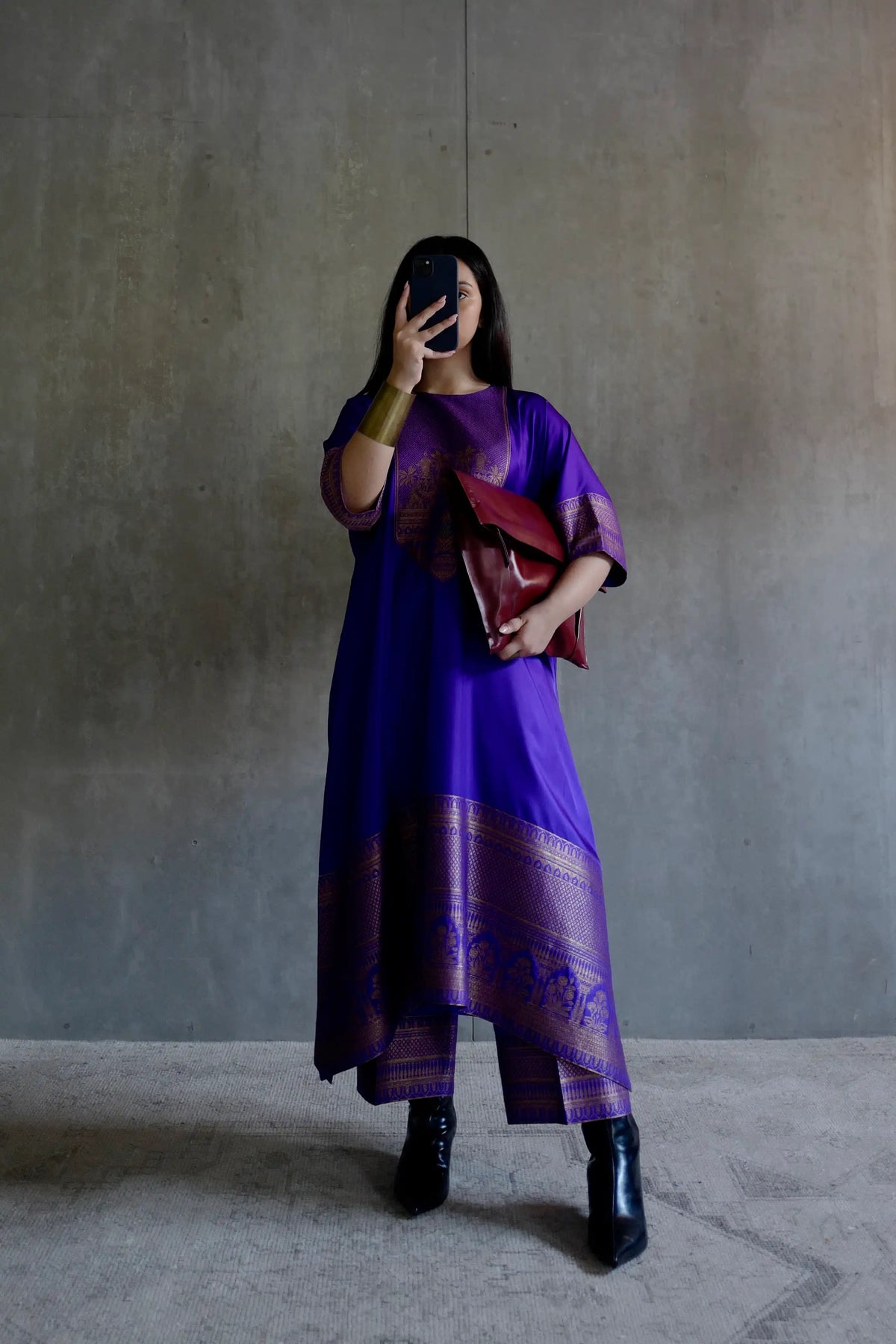 Sizing: The model is 5'8" (173 cms) and is wearing a free size tunic and free size lounge pant. The garment available for purchase is designed for a height of 5’4”.