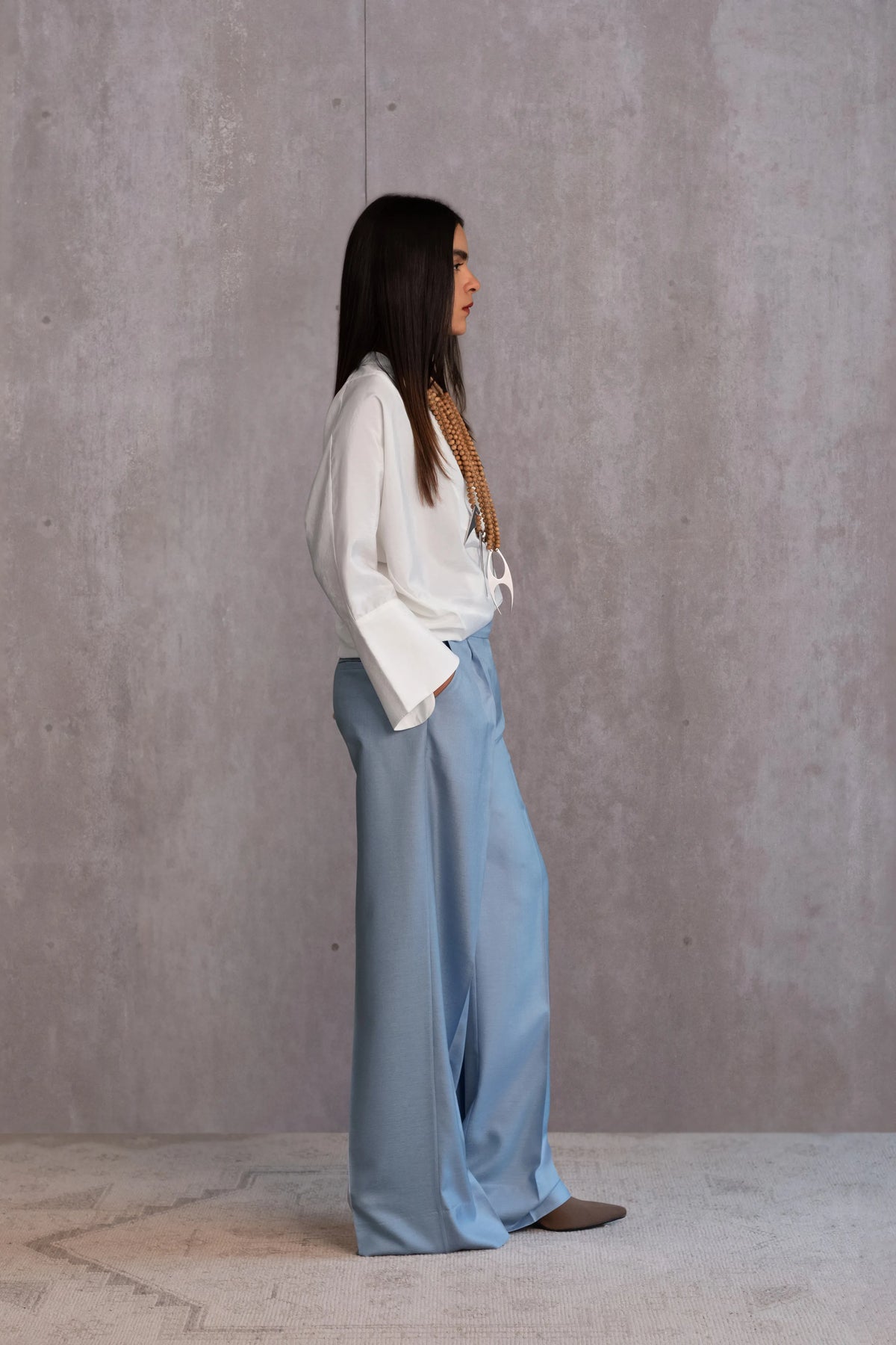 Sizing: The model is 5'5” (169 cms) and wears sample size F. The garment available for purchase is designed for height 5’4” (163 cms).